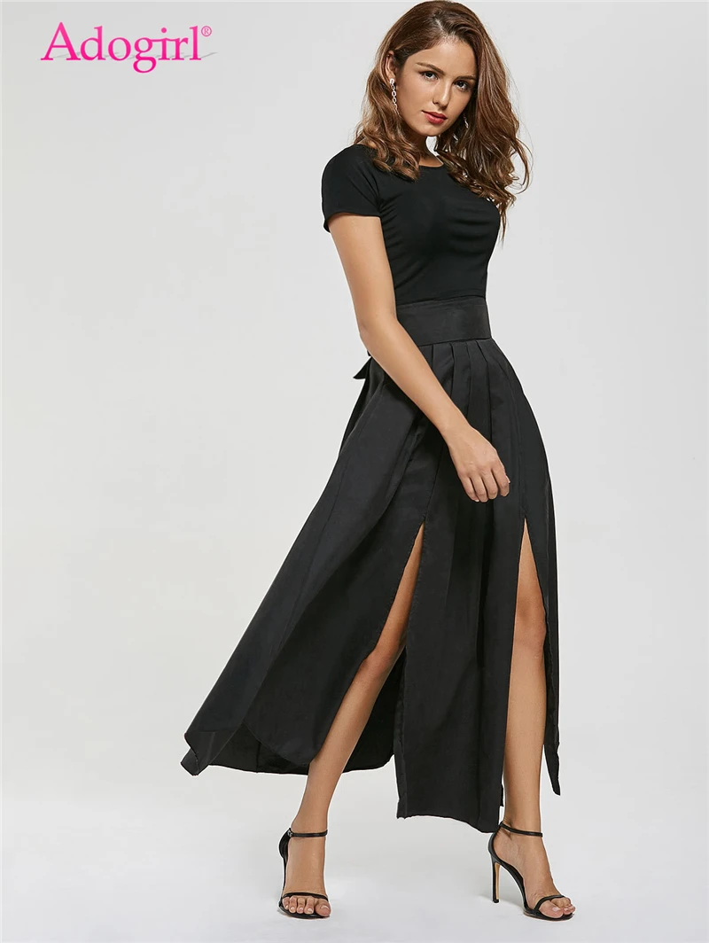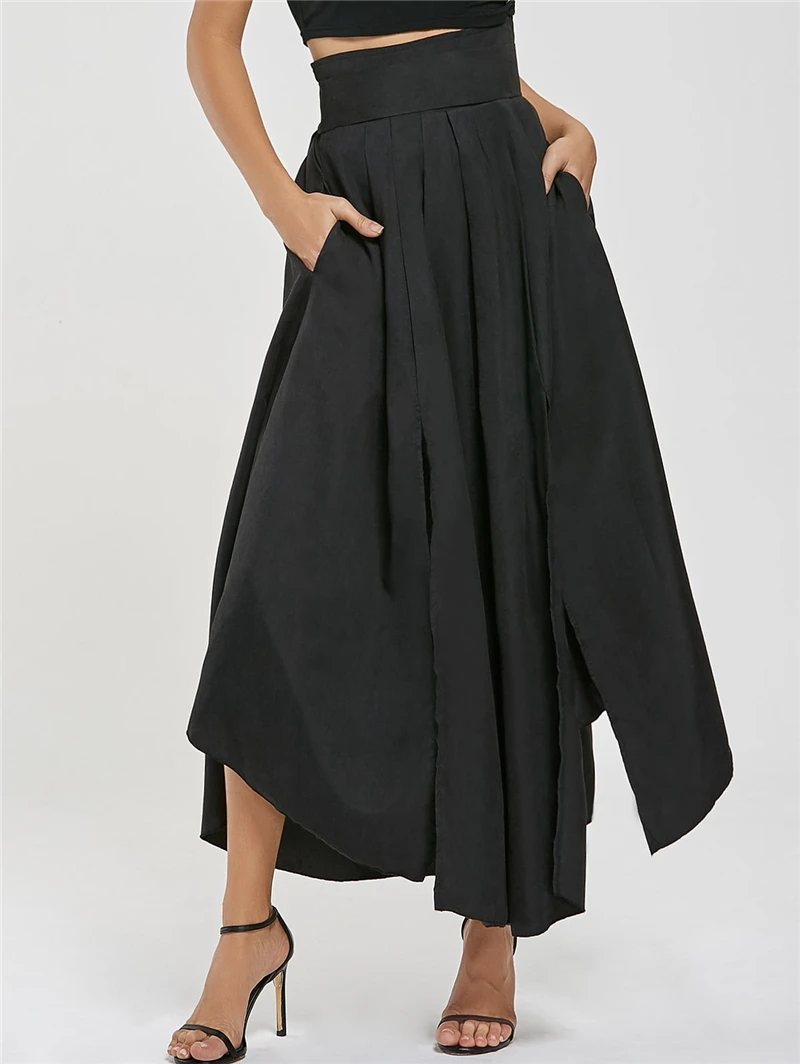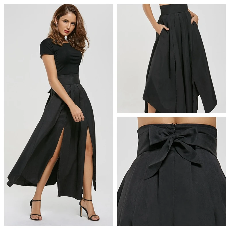 Offerte Adogirl Solido Nero Delle Donne Maxi Gonna Bow Decor Tasche Fessura del Lato di Alta Vita Asymmetraical Casual Gonne Club Partito Sottoveste Miglior Prezzo Online